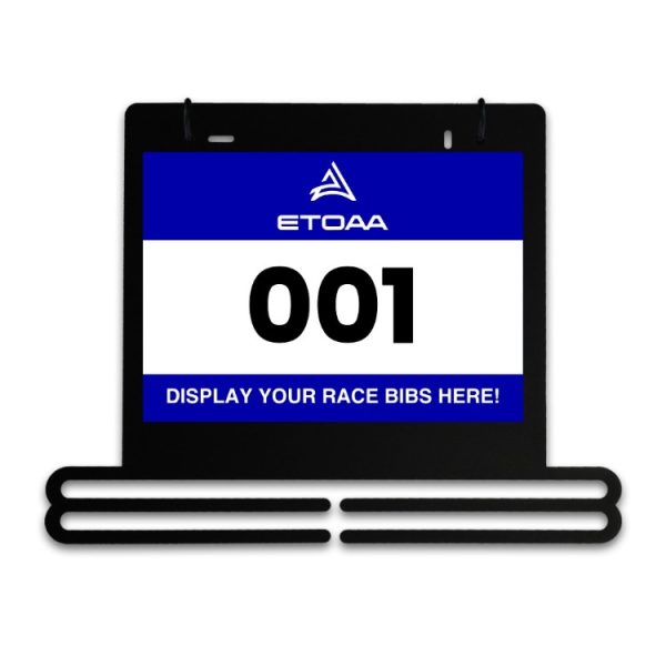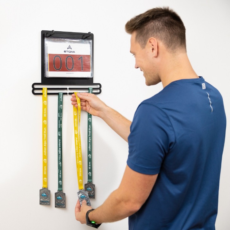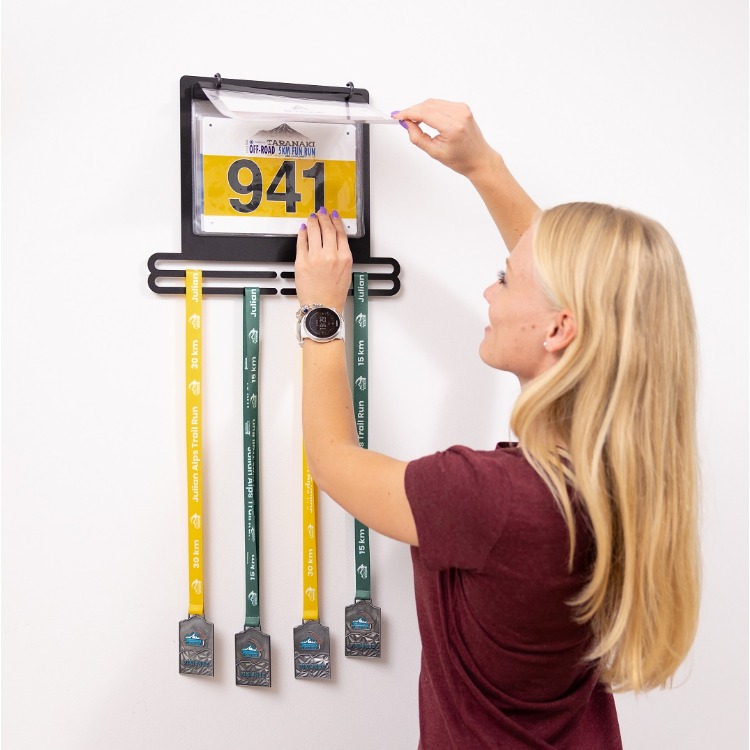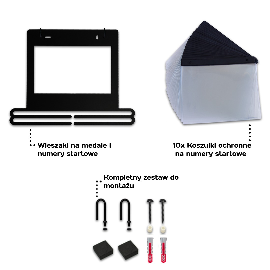 Wieszak umożliwia łatwe przeglądanie kolekcji numerów startowych, zdjęć, certyfikatów sportowych lub innych pamiątek z zawodów.